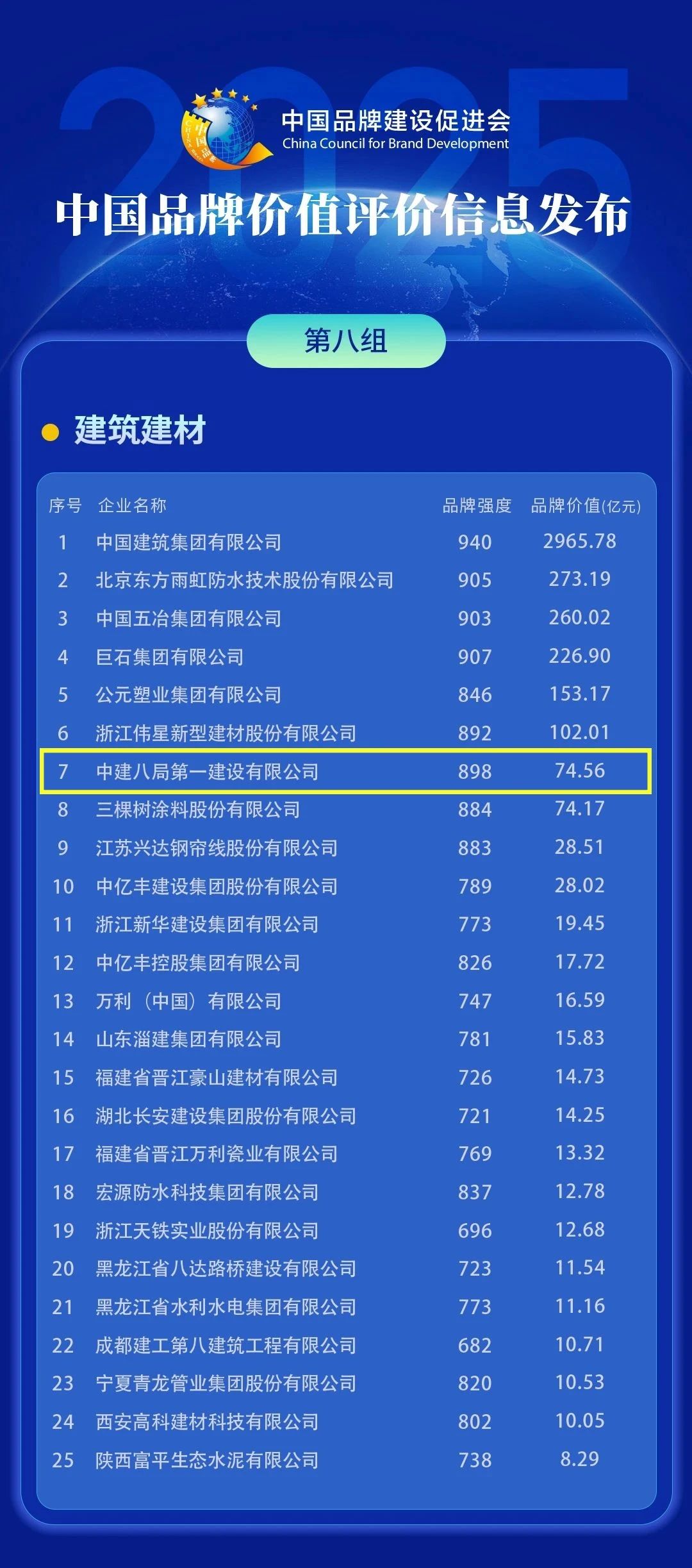 5月10日,由中國品牌建設(shè)促進(jìn)會(huì)、中國資產(chǎn)評估協(xié)會(huì)主辦,新華社品牌工作辦公室、《中國品牌》雜志社等單位承辦的“2025中國品牌價(jià)值評價(jià)信息”在浙江德清正式發(fā)布。 中建八局一公司以品牌強(qiáng)度898、品牌價(jià)值74.
