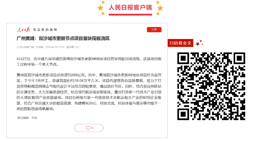 內(nèi)容摘要:4月30日,人民日報客戶端報道《廣州黃埔:雙沙城市更新節(jié)點項目首塊筏板澆筑》,點贊中建八局承建的黃埔雙...