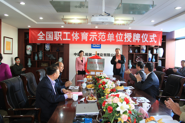 儀式上,中建體協(xié)秘書(shū)長(zhǎng)彭桂臣宣讀了《中華全國(guó)總工會(huì)、國(guó)家體育總局關(guān)于命名全國(guó)職工體育示范單位的決定》,國(guó)家體育總局群體處處長(zhǎng)王小寧為一公司授牌。
