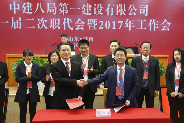 董文祥就十一屆一次職代會提案落實情況、十一屆二次職代會提案審查情況作了報告。公司黨政領(lǐng)導(dǎo)班子作了廉政承諾,領(lǐng)導(dǎo)班子及成員進行了述職述廉,與會職工代表作了民主評議。會上,河南分公司三門峽萬達項目、安徽人保項目、北京分公司物資設(shè)備部、廣東分公司馬會項目分別就總承包管理、設(shè)計+BIM、以鋼代木、項目資金策劃進行了經(jīng)驗交流,13個分公司作了述職報告。大會表彰了先進,進行了項目兌現(xiàn)。會議期間,公司黨政領(lǐng)導(dǎo)與基層單位簽訂了集體合同、經(jīng)營目標(biāo)責(zé)任書。