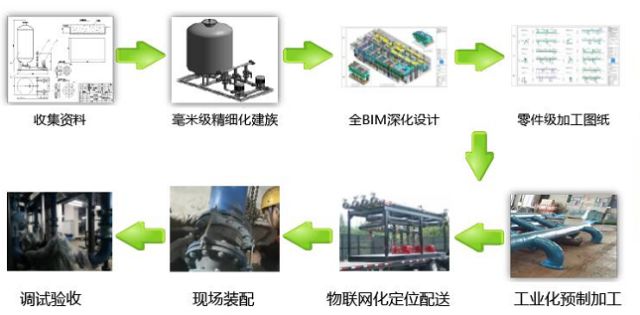 機房深化設計并出具圖紙:分析圖紙并收集整合大量資料;對機房內(nèi)的機械設備、閥部件等構件進行1:1毫米級精細化建族;充分利用狹小機房空間,深化設計形成多套方案;利用BIM模型結(jié)合VR虛擬現(xiàn)實技術選擇最優(yōu)的方案,并運用Revit軟件直接出圖;綜合考慮施工順序、運輸空間、操作便利性等因素,對設備、管道等進行分段并形成加工圖紙。最后,將預制化圖紙交付場外工廠進行預制化加工。整個過程用時25天。