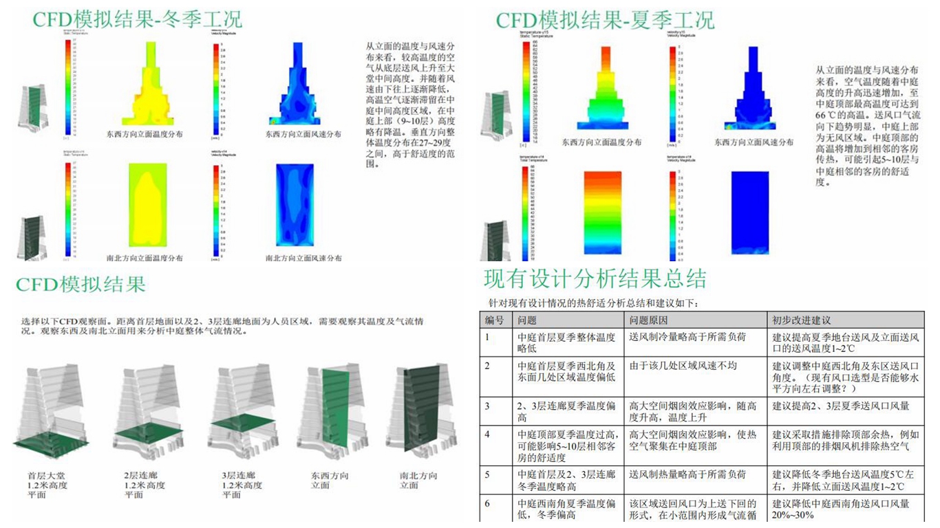 項目創(chuàng)新采用CFD技術進行現(xiàn)場舒適度模擬。分析優(yōu)化暖通圖紙,采集大量影響舒適度的相關參數(shù),對整個大堂內(nèi)“夏季”、“冬季”兩種工況進行模擬,最終通過計算機大量的數(shù)據(jù)計算得出結(jié)果,并提出改進意見,將舒適度調(diào)整到最佳。