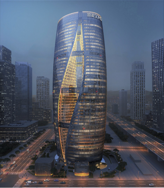 麗澤SOHO中央中庭高度近200米,從地面直通頂層,為目前全世界最高中庭;擁有優(yōu)美的設(shè)計(jì)造型,由流線型塔樓分立兩側(cè),如DNA雙螺旋結(jié)構(gòu)盤旋而上,兩棟樓扭轉(zhuǎn)到一起,產(chǎn)生“擁抱”的效果,使得建筑內(nèi)的中庭從大堂里面向上看、從辦公室內(nèi)往外看都會(huì)產(chǎn)生螺旋的空間變化;本工程結(jié)構(gòu)造型復(fù)雜,外立面均為變曲率曲面,施工難度大。