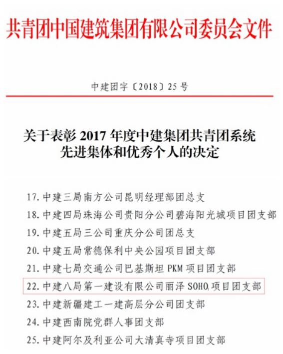 近日,中建集團(tuán)對(duì)共青團(tuán)系統(tǒng)先進(jìn)集體和優(yōu)秀個(gè)人進(jìn)行表彰,公司麗澤SOHO項(xiàng)目榮獲中建集團(tuán)2017年度“五四紅旗團(tuán)組織”稱號(hào)。此次中建集團(tuán)“五四紅旗團(tuán)組織”共有30個(gè)團(tuán)組織入選,只有8個(gè)是基層項(xiàng)目團(tuán)組織,麗澤SOHO項(xiàng)目成為八局唯一入選的基層項(xiàng)目團(tuán)組織。