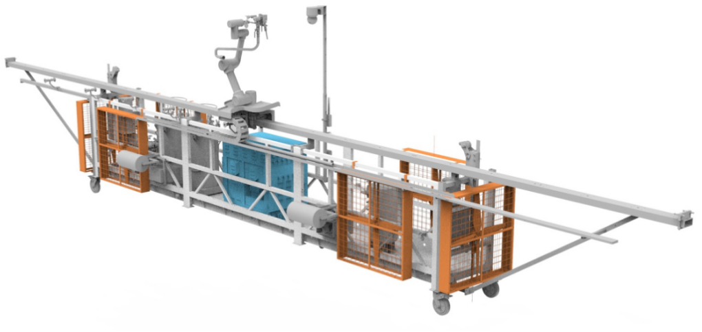 機(jī)器人以吊籃模塊為基礎(chǔ)平臺(tái),通過(guò)導(dǎo)軌搭載噴涂設(shè)備代替外墻施工人員,減輕人工高強(qiáng)度作業(yè)的負(fù)擔(dān)以及風(fēng)險(xiǎn),同時(shí)降低漆霧對(duì)人體的傷害。