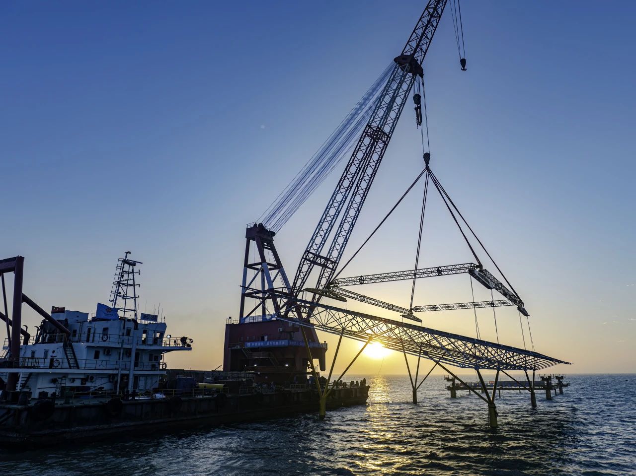 一望無(wú)際的大海中矗立著一條巨大的施工船只,平靜柔和的海面上,機(jī)器的轟鳴聲與海浪聲交織成壯麗的交響樂(lè),這是中建八局承建的國(guó)華HG14海上光伏項(xiàng)目的日常剪影。近日,項(xiàng)目完成首個(gè)光伏平臺(tái)吊裝,正推動(dòng)著中建藍(lán)的夢(mèng)想一步步向蔚藍(lán)深處延伸。