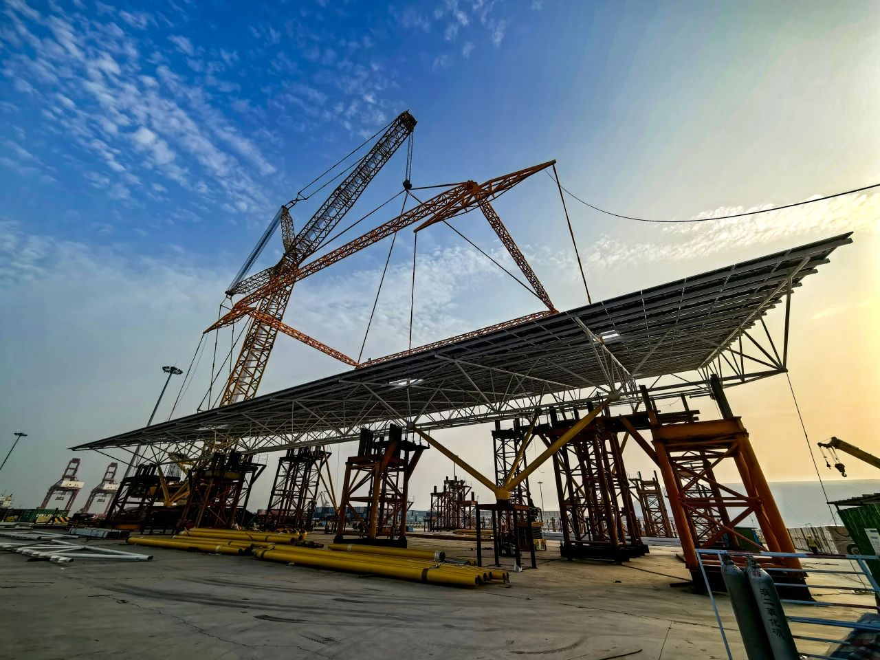 龐大的光伏平臺(tái)由無(wú)數(shù)重要小部件匯聚而成,包括上部、下部結(jié)構(gòu)及780塊光伏組件等,在港口16個(gè)拼裝區(qū)進(jìn)行拼裝、焊接、防腐、組件安裝后,由1250噸履帶吊運(yùn)送至4個(gè)支腿區(qū)進(jìn)行支腿安裝。
