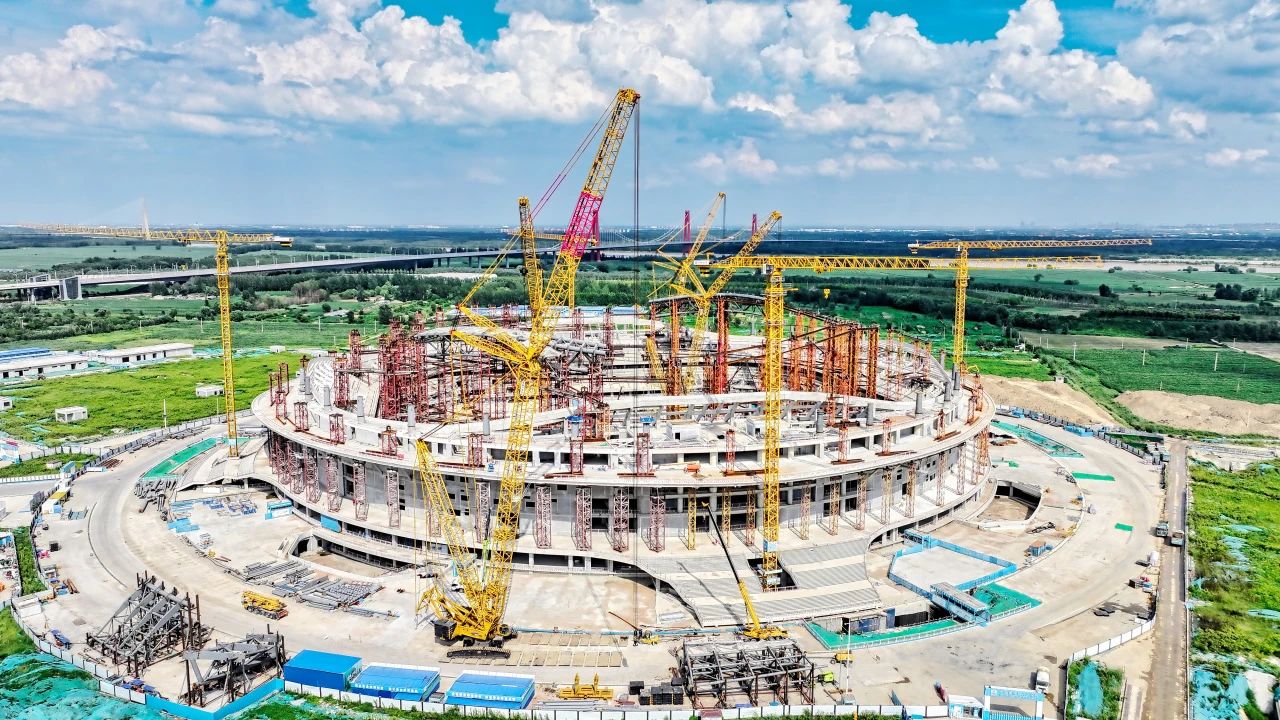 項(xiàng)目采用世界杯FIFA最新標(biāo)準(zhǔn),將多種高新科技融入建造當(dāng)中,是世界首個平面單層膜輪輻式索膜結(jié)構(gòu)體系,國內(nèi)首例專業(yè)足球場大規(guī)模應(yīng)用高透光率PTFE網(wǎng)格膜材料,國內(nèi)施工最復(fù)雜的專業(yè)足球場之一。目前項(xiàng)目處于屋蓋鋼結(jié)構(gòu)施工階段,預(yù)計(jì)2024年完成合攏。
