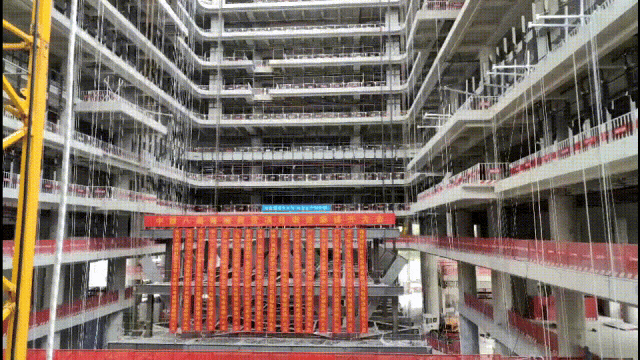 項目建筑高度200米,自下而上分布5層屋面園林景觀,形成“空中疊院”的建筑形象,擁有大灣區(qū)首個54米通高的嶺南中庭,高區(qū)鋼連廊總重量2300噸,跨度36.8米,提升高度74.4米,是東莞市同高度水平鋼結(jié)構(gòu)提升重量最大工程。