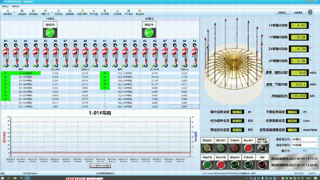 研發(fā)位-力混合控制算法,采用PID閉環(huán)控制與模糊自適應(yīng)模型動態(tài)調(diào)節(jié)頂升速度,確保施力均衡整合傾角、位移等數(shù)據(jù)構(gòu)建三維模型,直觀展示升降過程各項數(shù)據(jù),通過控制柜與中控雙通道交互,讓施工人員可實時查看數(shù)據(jù)接收預(yù)警并及時進行干預(yù)。