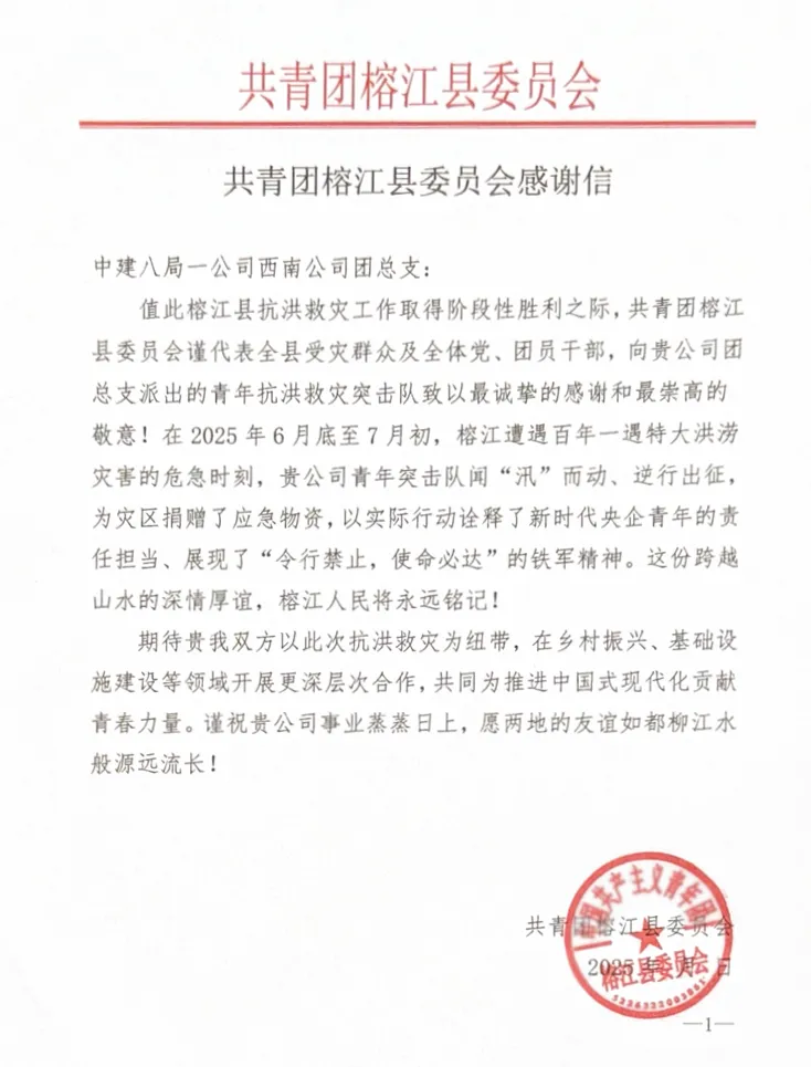 經(jīng)過幾天奮戰(zhàn),突擊隊(duì)圓滿完成任務(wù)。撤離前,榕江縣村民與當(dāng)?shù)仄髽I(yè)自發(fā)組織晚會,為各位志愿者送上象征“喜慶、吉祥、圓滿”的“紅雞蛋”,以表示感謝。共青團(tuán)榕江縣委員會送來感謝信,對八局一公司的央企擔(dān)當(dāng)、鐵軍作風(fēng)表示認(rèn)可。