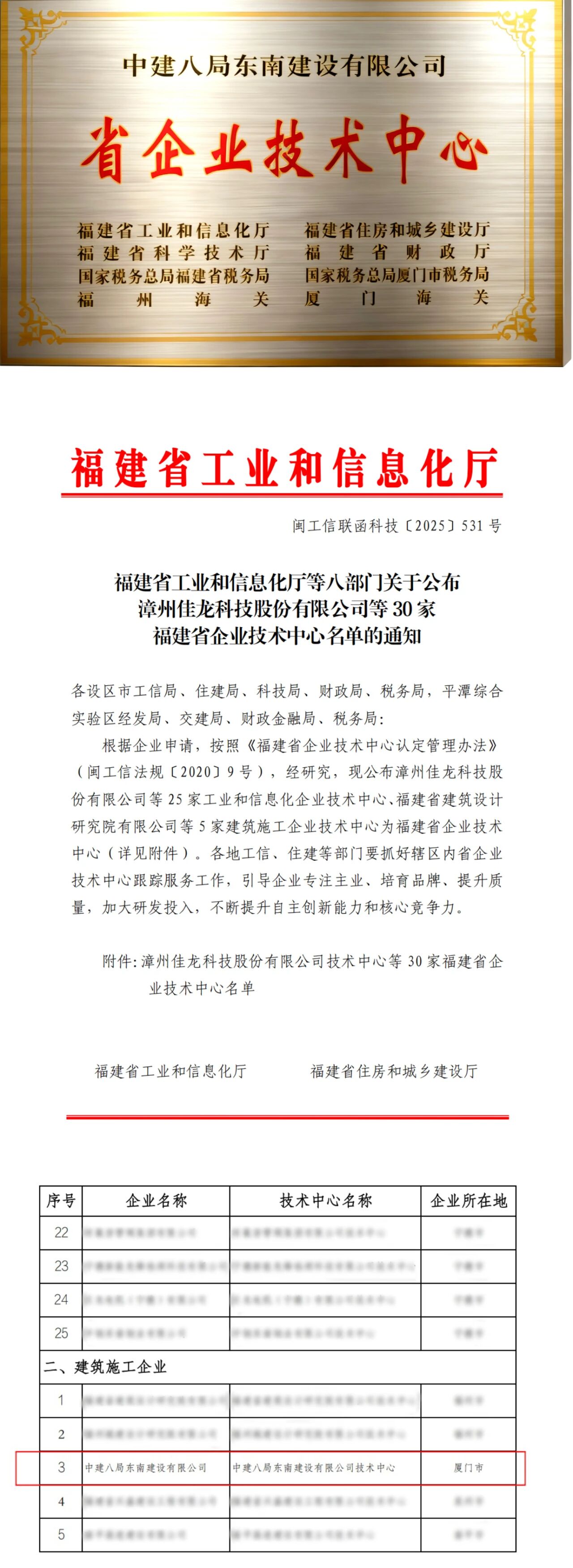 近日,經(jīng)福建省工信廳、省住建廳、省科技廳等八部門聯(lián)合認(rèn)定,中建八局東南建設(shè)有限公司成功獲批 “福建省企業(yè)技術(shù)中心”,成為此次通過認(rèn)定的 5 家建筑業(yè)企業(yè)之一,彰顯了其在智能建造、綠色施工等領(lǐng)域的核心研發(fā)實(shí)力與創(chuàng)新競(jìng)爭(zhēng)力。