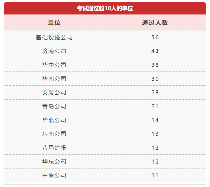 在今年 “一建” 考試中,共有6家二級(jí)單位取證超20人,基礎(chǔ)設(shè)施公司、濟(jì)南公司、華中公司取證人數(shù)位列前三甲。