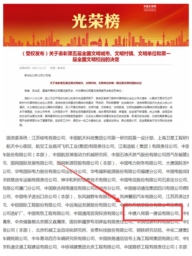 ??? 11月17日,全國(guó)精神文明建設(shè)表彰大會(huì)在人民大會(huì)堂隆重舉行,公司喜獲第五屆“全國(guó)文明單位”榮譽(yù)稱號(hào)! ????全國(guó)文明單位,是中央文明委授予積極開(kāi)展文明單位創(chuàng)建活動(dòng),“三個(gè)文明”建設(shè)協(xié)調(diào)發(fā)展,精神文明建設(shè)成績(jī)突出,能夠在全國(guó)發(fā)揮示范作用的單位的榮譽(yù)稱號(hào),是目前國(guó)家綜合性獎(jiǎng)項(xiàng)的最高榮譽(yù)。 ????近年來(lái),公司在文明創(chuàng)建方面緊緊圍繞“黨建先行、價(jià)值引領(lǐng)、業(yè)...