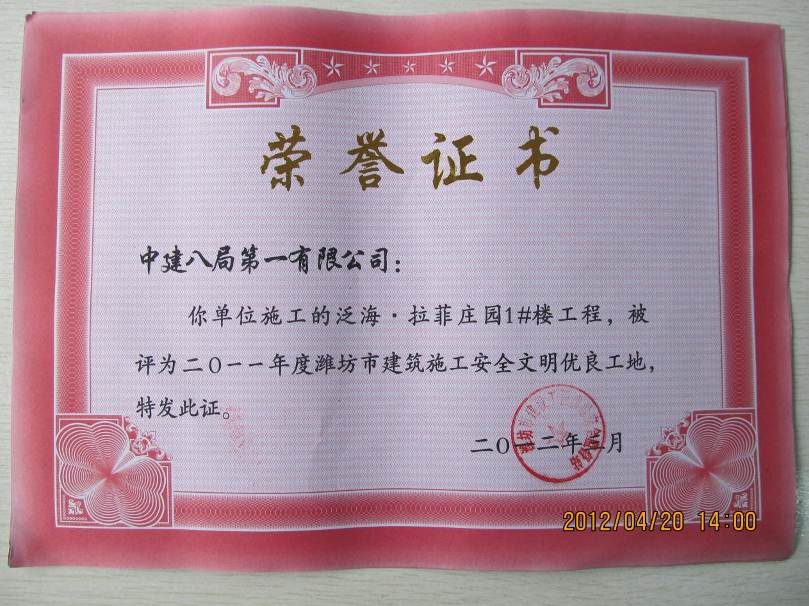 近日,濰坊‘泛海.拉菲莊園1#-5#樓’工程,經(jīng)濰坊市建筑工程質(zhì)量安全監(jiān)督站檢查評定,并通過網(wǎng)上公示后,榮獲2011年度濰坊市建筑施工“安全文明優(yōu)良工地”。