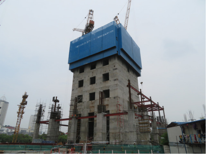 印尼一號雙塔項目北塔樓地上59層,南塔樓地上58層,標準層高4.8m,建筑高度303米,核心筒混凝土強度在FC70(相當于國內C85等級)到FC40之間依次變化,標準層單次最大混凝土澆筑量460m3,最大鋼筋用量52t。為加快施工進度,項目不斷優(yōu)化鋼筋綁扎工序,逐步淘汰施工效率較低的勞務班組,同時采取了兩班制作業(yè)制度并設置了節(jié)點目標獎勵等措施,取得了良好效果。(李賀雷)