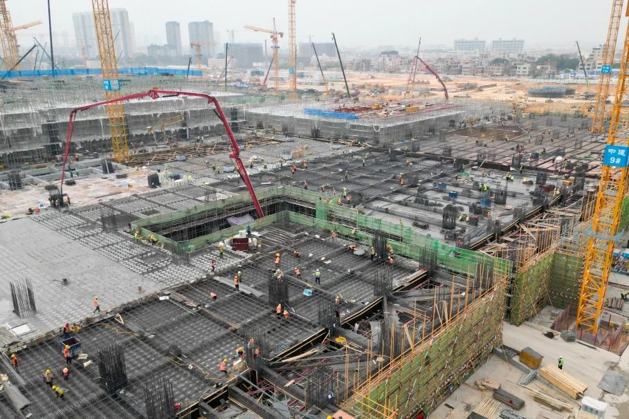 面對(duì)近40萬(wàn)平方米的超大建造面積,混凝土澆筑一次成優(yōu)尤為重要,項(xiàng)目建設(shè)過(guò)程中創(chuàng)新采用“跳倉(cāng)法+錯(cuò)口縫”施工工藝,超長(zhǎng)結(jié)構(gòu)按適宜大小分倉(cāng),設(shè)ABCD四個(gè)分區(qū),劃分56個(gè)流水段,相鄰分倉(cāng)施工縫設(shè)置錯(cuò)口縫,降低施工縫部位滲漏風(fēng)險(xiǎn)。