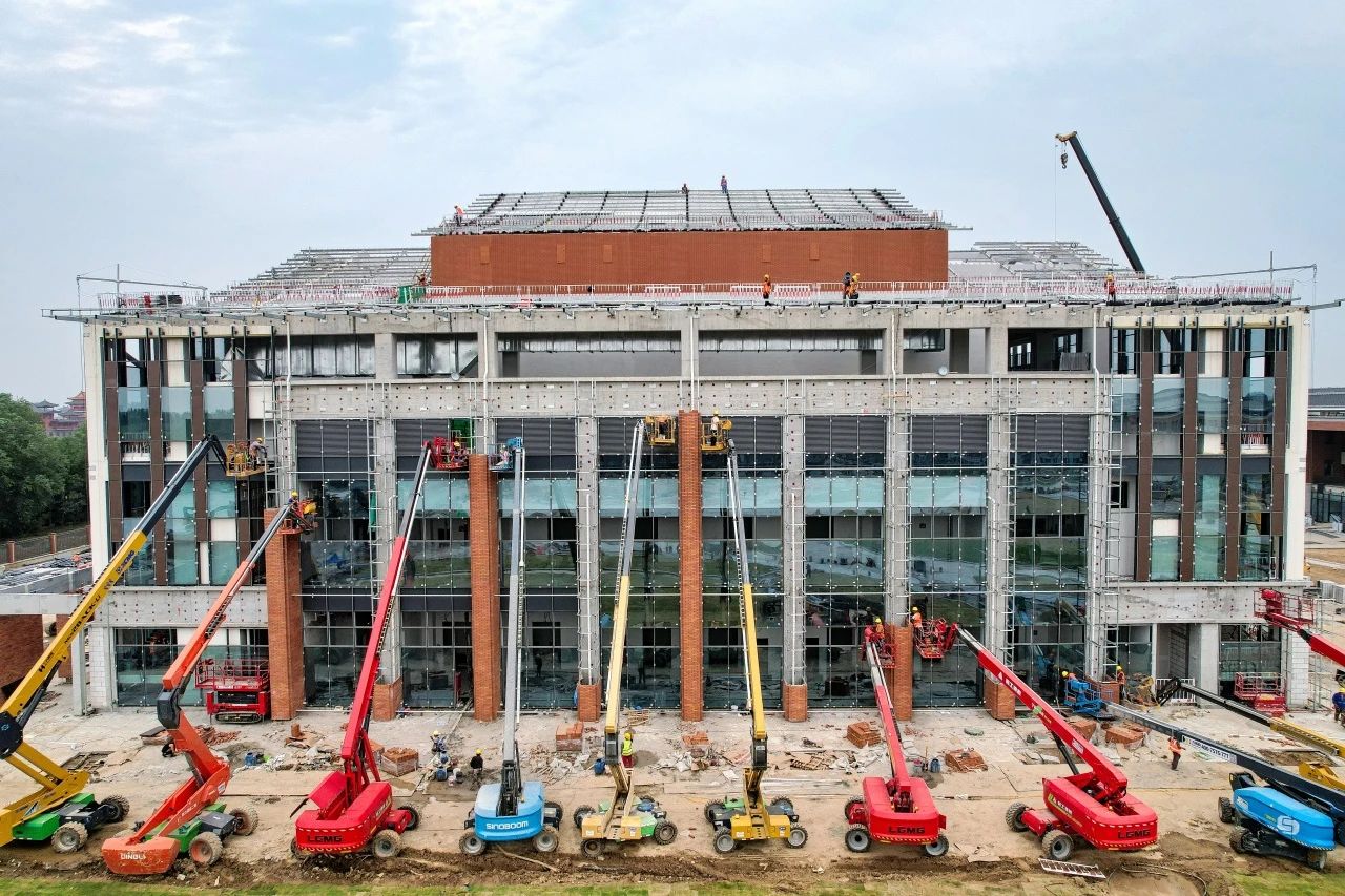 項(xiàng)目表演實(shí)訓(xùn)樓內(nèi)設(shè)2個(gè)專業(yè)演播廳,可容納2180人教學(xué)表演,結(jié)構(gòu)單層高度超30米、跨度超40米且包含大量勁性構(gòu)件、鋼結(jié)構(gòu)網(wǎng)架,項(xiàng)目編寫超高超長(zhǎng)雙層梁工程施工工法,成功破解此類工程高空作業(yè)、鋼筋布置、撓度控制、結(jié)構(gòu)穩(wěn)定等系列難題。