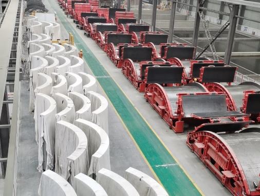 混塔分片式構(gòu)件是將現(xiàn)場作業(yè)搬進工廠,生產(chǎn)效率高、質(zhì)量成品效果好、綠色環(huán)保無污染,生產(chǎn)完成后運輸?shù)浆F(xiàn)場進行快速拼裝,同時配合使用臥式模具提高精度與效率,實現(xiàn)模具的迅速轉(zhuǎn)場,大大縮短了施工周期。