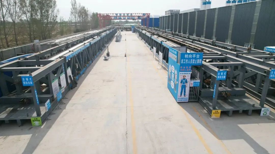 項目在山東省內高速公路項目建設中首次應用折線法先張工字梁針,對黃河特大橋北側堤外引橋592片先張法工字梁施工;項目聯(lián)合山東省交通規(guī)劃設計院共同打造桁架自錨式整體張拉臺座,一個臺座可同時生產(chǎn)三片梁,具有通用性強、周轉率高、地基承載要求低、制梁效率高且質量可控等優(yōu)點。
