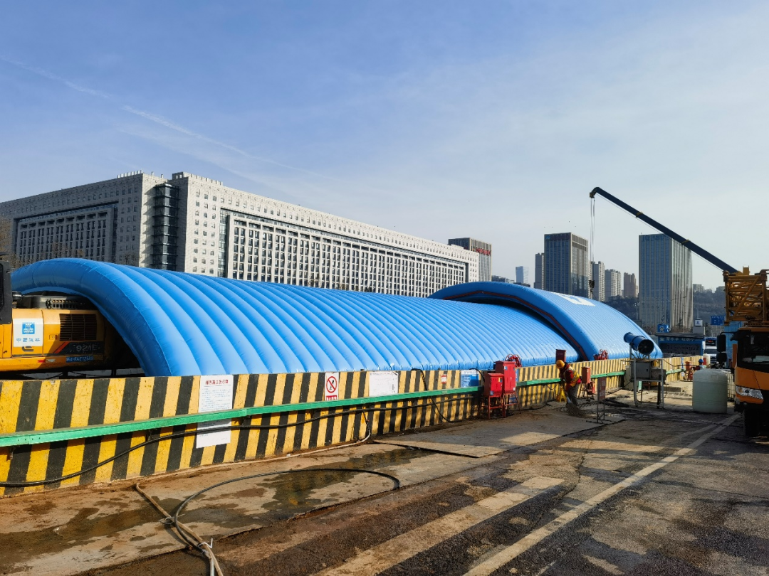 濟南軌道交通7號線的滑移型氣肋式基坑氣膜屬全國首例,也是基坑氣膜在地鐵項目的首次應(yīng)用。通過安裝高強度、高耐久性、防火性能好的充氣膜材料,向膜內(nèi)充氣,在工地上方形成一個密閉的空間,具有良好的隔音和防塵性能,同時還能保溫、防雨雪,改善冬季施工環(huán)境,給建設(shè)者們提供更好的施工條件。