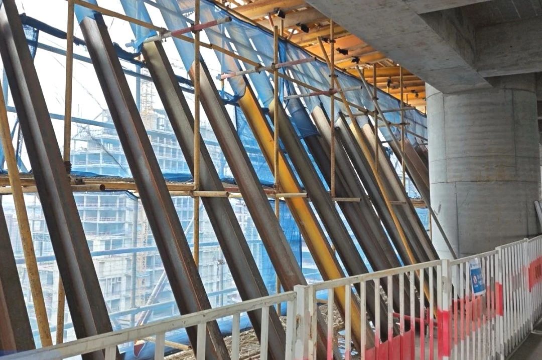 針對現(xiàn)場大跨度連廊需高空散拼、厚板焊接、頂板承載力不足等難點,項目與專家、設(shè)計院組成攻堅團隊,在汽車吊行走路線搭建支撐體系,對首層樓板實施整體加固,通過高區(qū)地面拼裝+整體提升、中區(qū)格構(gòu)柱支撐+分段吊裝的方式,實現(xiàn)拼裝、焊接同步推進,確保鋼連廊平穩(wěn)快速提升。