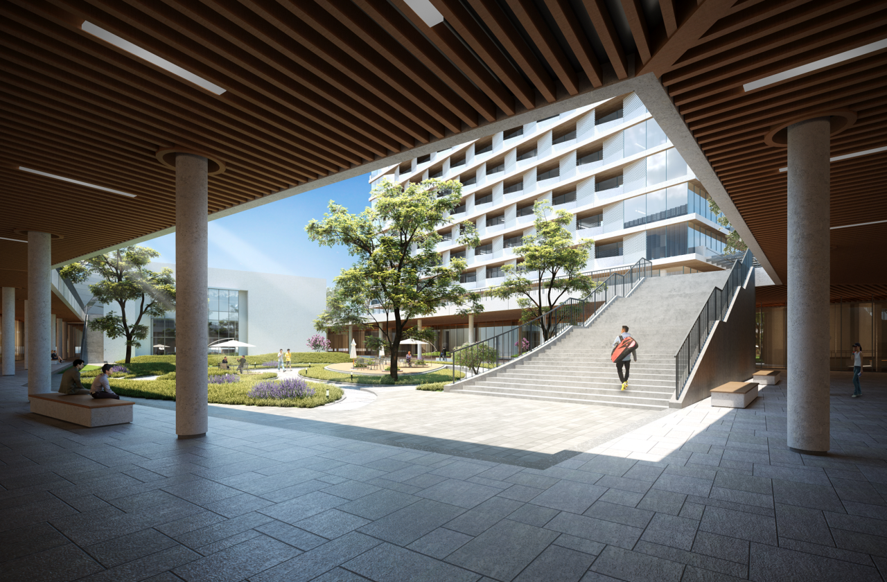 項(xiàng)目在“大平臺(tái)”中部打造下沉庭院,將首層訓(xùn)練館降低到與負(fù)一層平齊,使內(nèi)部場(chǎng)地和城市道路天然隔開,為運(yùn)動(dòng)員創(chuàng)造安靜私密的內(nèi)向性空間,且降低了龐大體量對(duì)臨近道路造成的壓迫感。