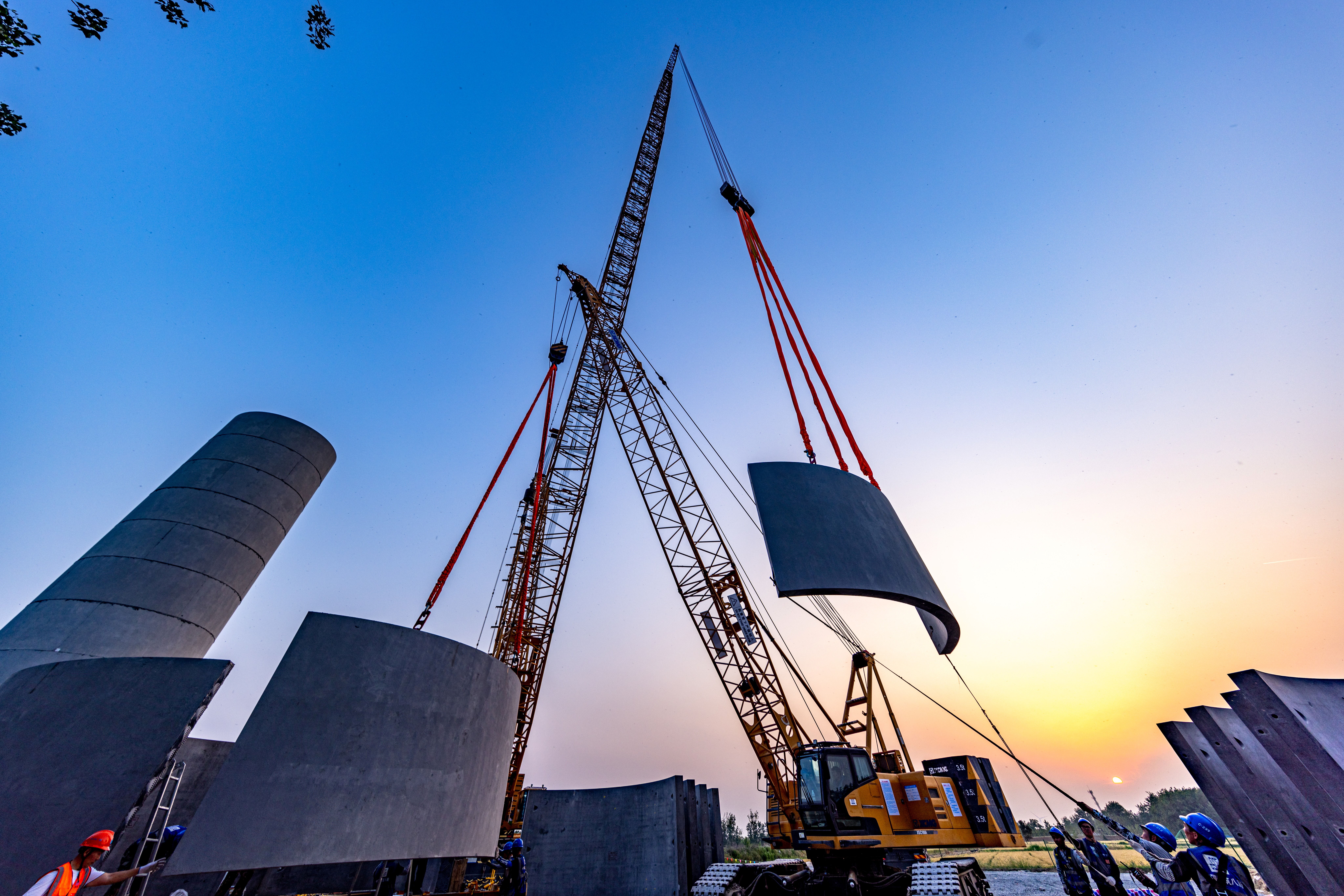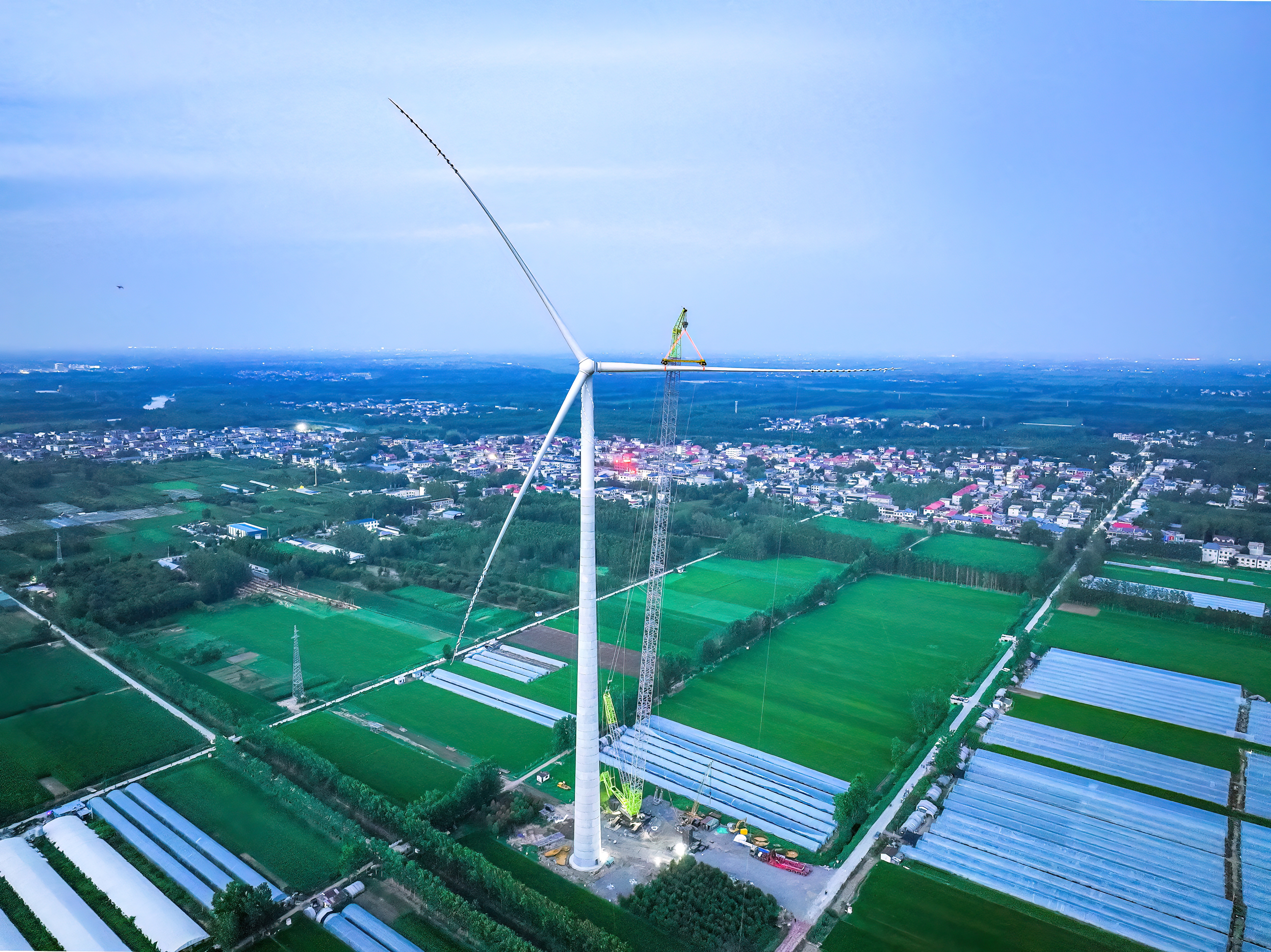 此次吊裝的風(fēng)機高185米,采用“主吊+副主吊”吊裝方式,實現(xiàn)46節(jié)混塔與2節(jié)鋼塔高強螺栓連接,127噸機艙、直徑220米葉輪升空固定。項目團隊高度重視前期策劃,提前32天完成7個鄉(xiāng)鎮(zhèn)、20個行政村協(xié)調(diào)工作,采用“一機一案”的施工方式,克服大件運輸、大型設(shè)備吊裝危大工程管控等難點。“吊裝小組”使用智能化風(fēng)速儀、無人機、360°攝像頭等實時監(jiān)測,護航吊裝全過程,順利完成首臺風(fēng)機百米吊裝。