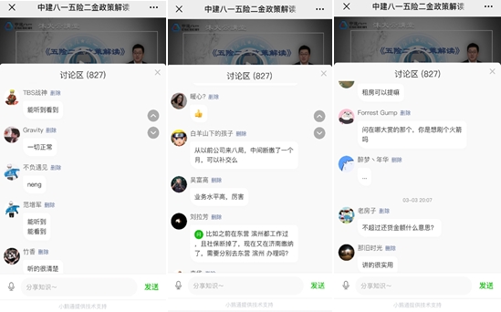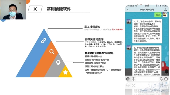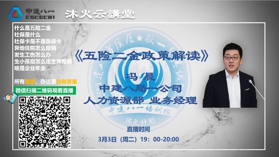 第一期“沐火云講堂”主題為《中建八一五險(xiǎn)二金政策解讀》,公司人力資源部開(kāi)發(fā)課程并由人力資源部業(yè)務(wù)經(jīng)理馮晨主播。鑒于公司青年員工居多,手機(jī)觀看直播的形式更易被員工所接受,直播間通過(guò)掃描微信二維碼掃描即可進(jìn)入,簡(jiǎn)單便捷,課程設(shè)有政策宣貫、交流答疑等環(huán)節(jié),內(nèi)容通俗易懂,員工參與積極。