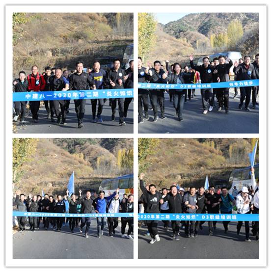 11月8日培訓內容為30公里領導力徒步活動。清晨,公司黨委書記、董事長齊朋,總經理、黨委副書記?;瘧棧笨偨浝硗跤袠?,副總經理劉明,副總經理李云,總會計師楊宏偉,紀委書記徐亮,黨委副書記、工會主席劉文納,副總經理李延佩,副總經理王濤,副總經理趙健,人力資源總監(jiān)、人力資源部經理聶麗12位領導帶領四支隊伍,整裝待發(fā)。出發(fā)前,各隊進行團隊風采展示,學員代表陳前鐘帶領大家宣誓。在完成準備活動后,公司領導帶領四隊學員正式踏上征程。