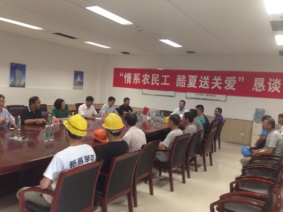 8月5日,濟(jì)南市人社局局長(zhǎng)王擁華、濟(jì)南市勞動(dòng)就業(yè)辦公室主任黃厚安等領(lǐng)導(dǎo)蒞臨濟(jì)南分公司銀豐財(cái)富廣場(chǎng)項(xiàng)目,為農(nóng)民工兄弟帶來了洗化等防暑降溫用品,并舉行了“情系農(nóng)民工、酷夏送關(guān)愛”懇談會(huì)。