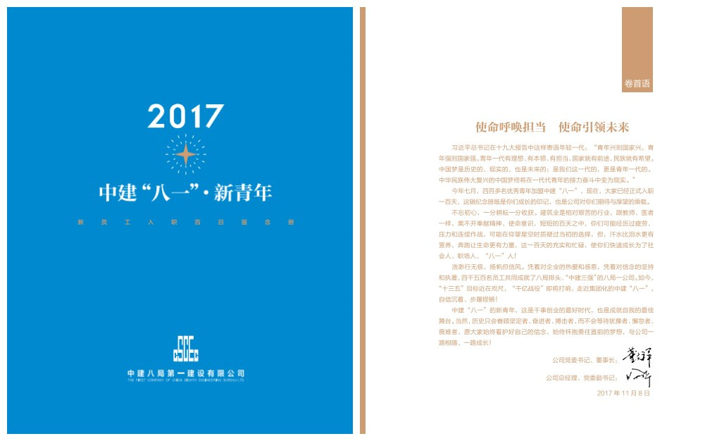 為了讓每位新員工在每一個(gè)人生階段都留下成長(zhǎng)印記,公司特地制作了《“八一”新青年紀(jì)念畫冊(cè)》,收錄了全體2017新員工的個(gè)人簡(jiǎn)介、成長(zhǎng)心得、未來愿景以及導(dǎo)師寄語,并由一公司領(lǐng)導(dǎo)為新員工代表頒發(fā)新青年紀(jì)念畫冊(cè)。
