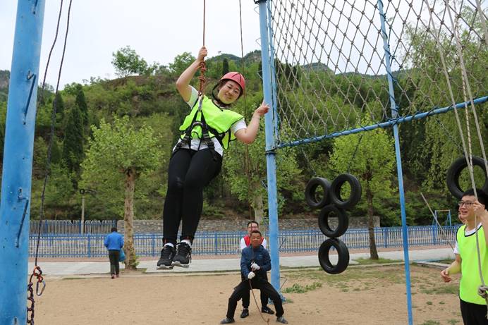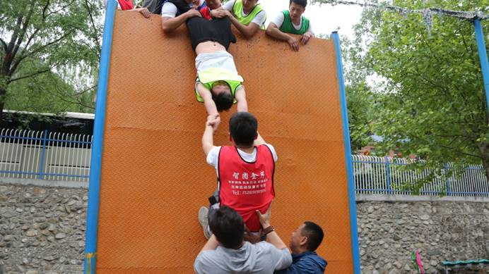 在培訓(xùn)講師的帶領(lǐng)下,大家穿上紅、黃、綠、藍(lán)四色馬甲,劃分為四組。在選隊(duì)長、隊(duì)秘、起隊(duì)名、隊(duì)歌、口號中,拉近了彼此的距離也加深了彼此的熟悉?!案呖諗鄻颉笔且粋€勇敢者的游戲,更是一個團(tuán)結(jié)協(xié)作的游戲,青年們克服內(nèi)心的恐懼,突破自我極限,勇敢走上“高空斷橋”,地面上的小伙們也在團(tuán)結(jié)協(xié)作,拉住繩索,為高空中行走的人保持穩(wěn)定的環(huán)境,在大家的努力下,“恐高癥”患者也成功走過高空斷橋,完美完成任務(wù)。在令人恐懼的指壓板環(huán)節(jié),大家密切配合,在疼痛中奔跑,不斷刷新通過記錄。在活動最后,也是最為艱難、最為感動的翻越“畢業(yè)墻”環(huán)節(jié),40名青年要翻越一面高4.2米的光滑墻面,在此過程中,大家不能借助任何外界的工具,所能用的資源只有每個人的身體?!鞍艘弧鼻嗄晖ㄟ^搭人梯的方法,發(fā)揮各自優(yōu)勢,身體強(qiáng)壯的自愿擔(dān)任底座,力量大的在墻上拉人,通過上下密切協(xié)作,不拋棄、不放棄,拼盡全力,最終只用了15分鐘完成全部翻越任務(wù),受到了講師的一致好評,青年們也在配合挑戰(zhàn)中感受到了團(tuán)隊(duì)的力量、為彼此的信任和幫助而感動。