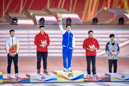 陳宇航(中間藍(lán)色衣服)站上金牌領(lǐng)獎臺