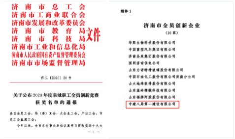 近日,山東省總工會(huì)、濟(jì)南市總工會(huì)相繼發(fā)布《關(guān)于公布 2020 年山東省全員創(chuàng)新企業(yè)的通知》和《關(guān)于2020年度泉城職工全員創(chuàng)新競(jìng)賽獲獎(jiǎng)名單的通報(bào)》,公司共榮獲5項(xiàng)獎(jiǎng)項(xiàng),分別是“山東省全員創(chuàng)新企業(yè)”、“濟(jì)南市全員創(chuàng)新企業(yè)”、“濟(jì)南市創(chuàng)新型班組(綠色產(chǎn)業(yè)園新型模架工廠班組)”、“濟(jì)南市創(chuàng)新能手(張軍)”、“濟(jì)南市職工優(yōu)秀技術(shù)成果”。
