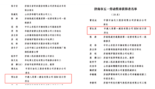 中建八局第一建設(shè)有限公司安裝公司機(jī)電工程BIM深化設(shè)計(jì)所所長常紅賓被授予“濟(jì)南工匠”榮譽(yù)稱號(hào)與濟(jì)南市五一勞動(dòng)獎(jiǎng)?wù)隆?/span>