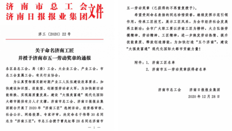 2020年12月28日,濟(jì)南市總工會(huì)、濟(jì)南日報(bào)報(bào)業(yè)集團(tuán)發(fā)布了《關(guān)于命名濟(jì)南工匠并授予濟(jì)南市五一勞動(dòng)獎(jiǎng)?wù)碌耐▓?bào)》,共命名30名同志為“濟(jì)南工匠”,市總工會(huì)授予28名同志濟(jì)南市五一勞動(dòng)獎(jiǎng)?wù)隆?/span>