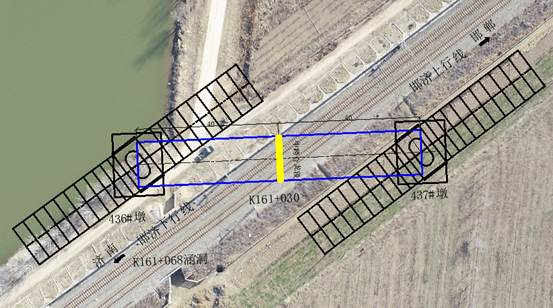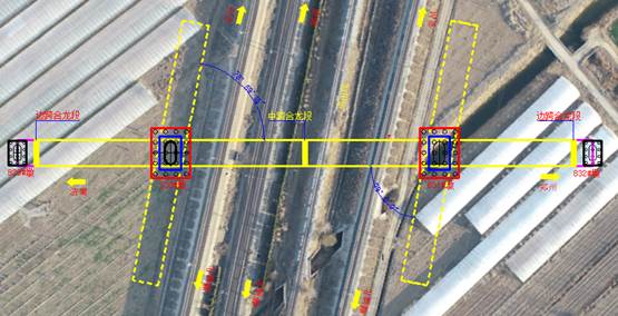 跨邯濟(jì)鐵路轉(zhuǎn)體施工連續(xù)梁主墩位于山東省聊城市東昌府區(qū),北城街道謝樓村西側(cè),橋梁位于新建鄭濟(jì)高鐵里程DK93+498.45位置,上跨位置位于邯濟(jì)鐵路博平站--聊城東站區(qū)間內(nèi),對(duì)應(yīng)邯濟(jì)線里程為K161+030。邯濟(jì)鐵路為國(guó)鐵I級(jí)雙線電氣化鐵路,連續(xù)梁在DK93+531.27處與既有邯濟(jì)鐵路上行線K161+033處相交,交角為145°15′;在DK93+542.87處與既有邯濟(jì)鐵路下行線K161+027處相交,交角為146°12′。